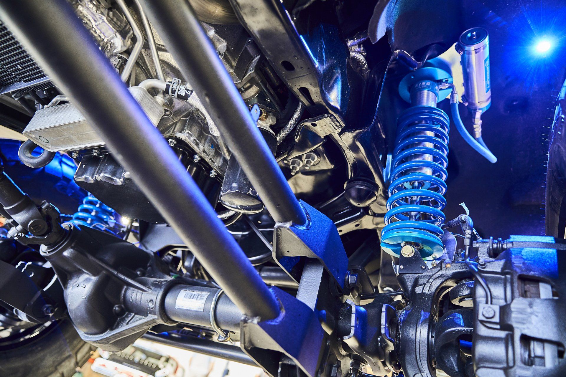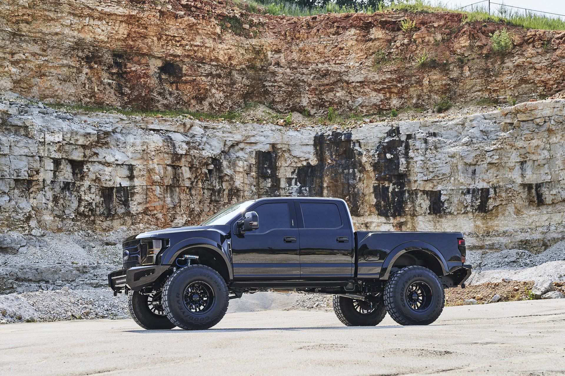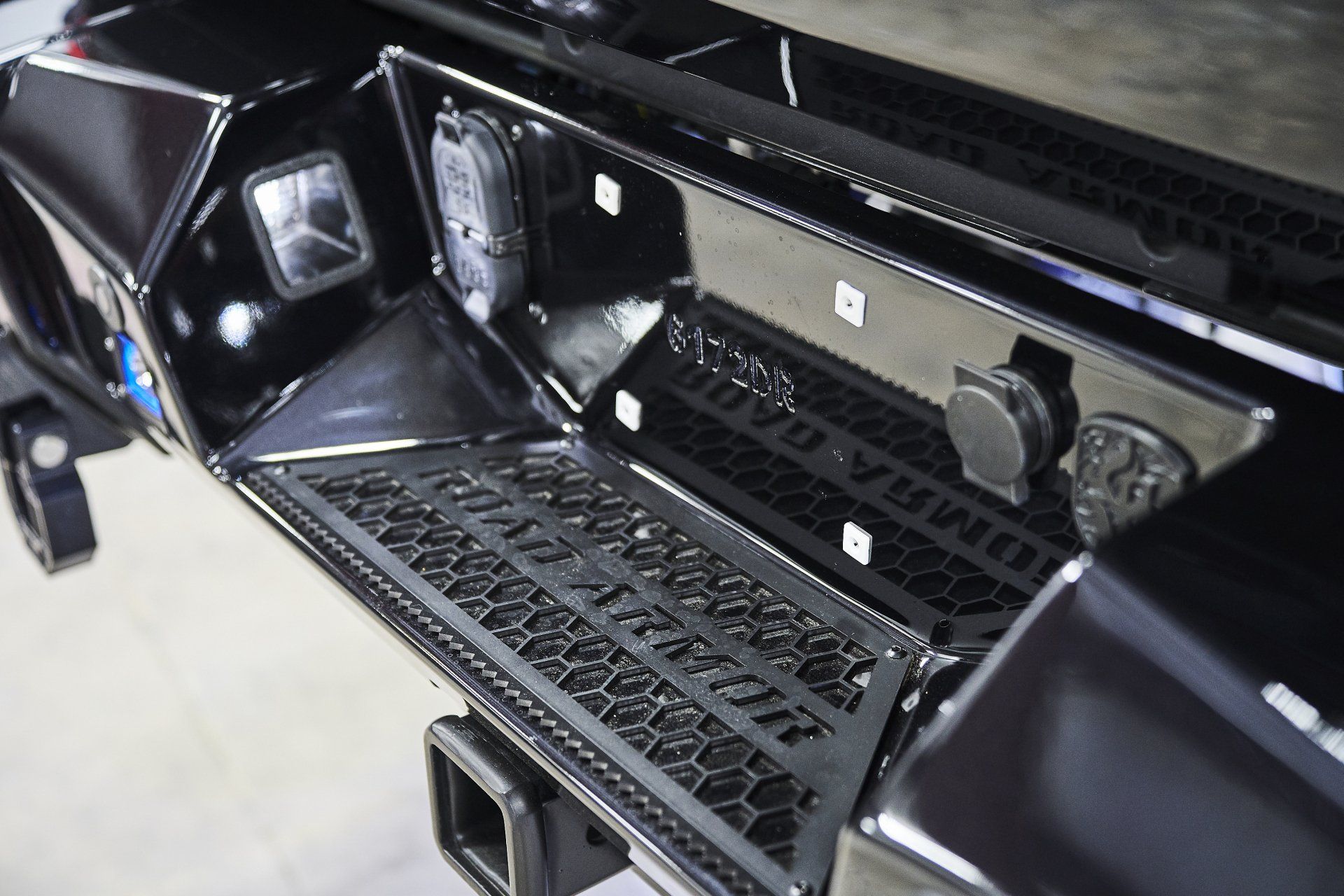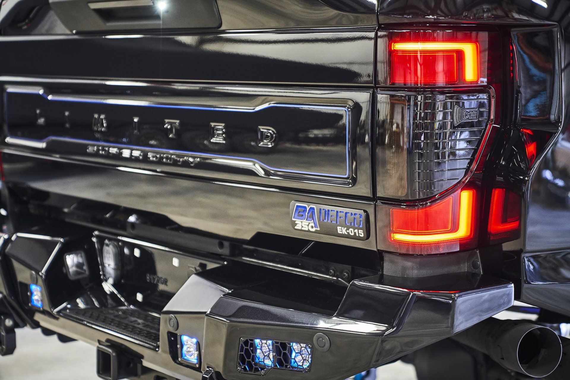 The BA350 combines a unique and intimidating appearance package with the fit and finish better than anything produced at the factory. We start with a new Ford F250 or F350, It’s completely disassembled to prepare for the Defco fenders, bedsides, hood and bumpers. Each panel is massaged to fit precisely with proper gaps. During the suspension addition, all factory non painted parts such as U-joints, Drive shafts and misc brackets are removed, prepped and painted chassis black so not to rust. Our award winning team also produces some of the finest custom cars and has many magazine cover cars and SEMA builds to its credit. Once the panels have passed our quality control process, the entire exterior of the truck is painted back to the factory color with extra coats of clear, then highly polished to a show quality finish. Bumpers are heavily modified to perfectly align with the new Defco fenders. Rigid lights fill the bumpers and optional rock lights light up the wheel wells at night.
